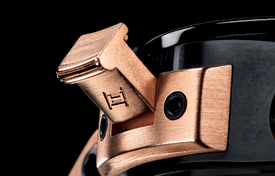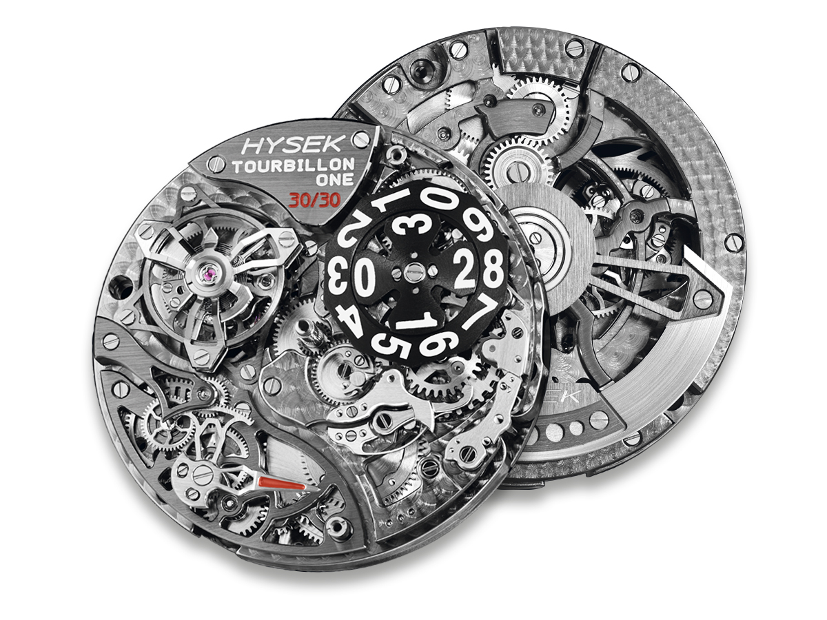 HW03A is the first movement imagined and manufactured by HYSEK, this piece of character, with a robust and asserted look is a visual and technical marvel. Its very sophisticated conception requires a very technical know how. This piece presents a power reserve and a big date.