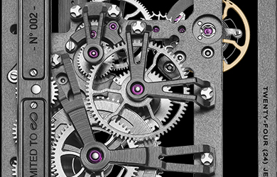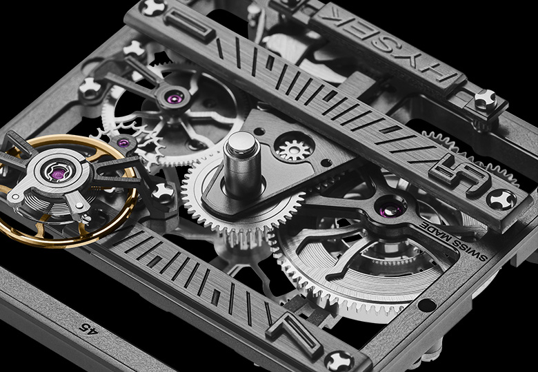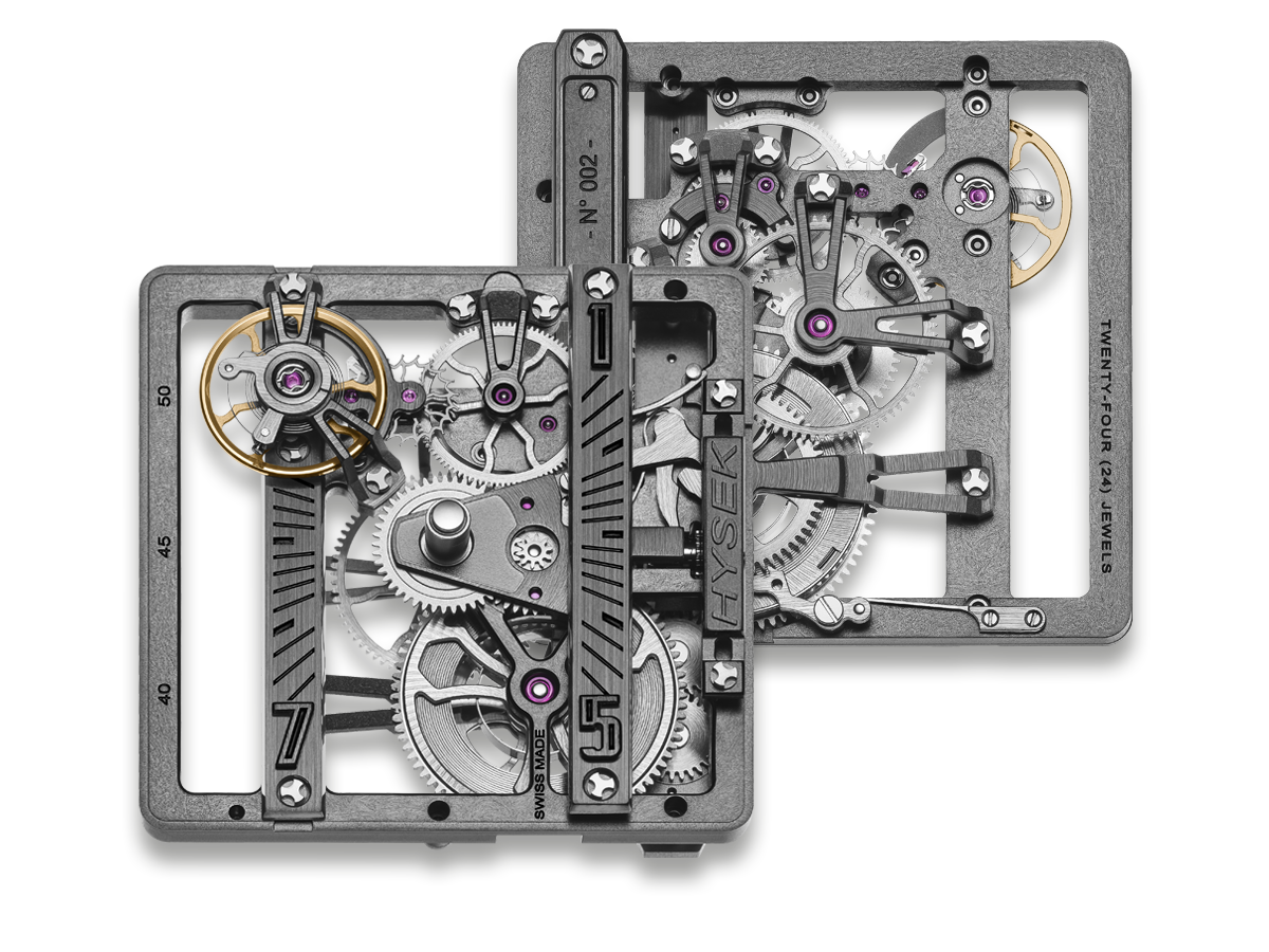 The design of each wheel required for this exceptional movement to operate features three double spokes, providing perfect technical and aesthetic balance – as well as being a recurring style signature for Hysek.