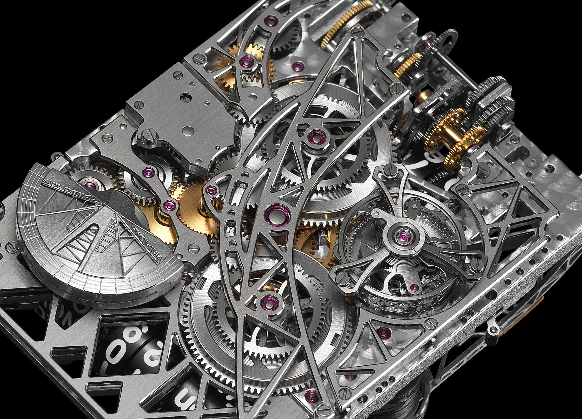 The main difficulty with displaying hours and minutes has been that of transposing a flat display to the roller-based system that constitutes the guiding principle of the Colossal in both technical and aesthetic terms. One that barrier had been overcome, Hysek then set out to resolve one of the most insidious challenges with roller displays: the shift from 23.59 to 00.00. Logically speaking, the hour unit roller (the “3” in 23.59) should continue on its course to display a 4; but that would end up displaying the non-existent time of 24.00, inevitably followed by 25.00, and so on.