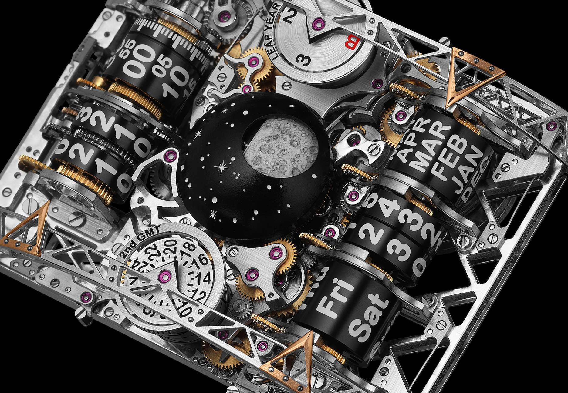 To prevent that, Hysek has developed an exclusive system – a world first: a few minutes before midnight, the roller discreetly moves backwards from a “3” to a “9” position, so that it can then jump, appropriately enough, to “0” – such that midnight is properly displayed. A patent has been filed for the reverse-and-forward roller system. It is based on an assembly comprising two main wheels that complete one revolution every 24 hours.