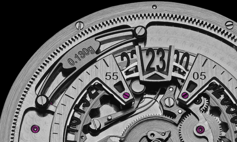In the HW63 manufacture caliber, the minutes display is not powered from the centre: instead, it rotates around the inner edge of the bezel in a module mounted on an external arc, linked to a gear arrangement concealed beneath the bezel. This puts the module in orbit around the outside of the dial, guided by the gear system.