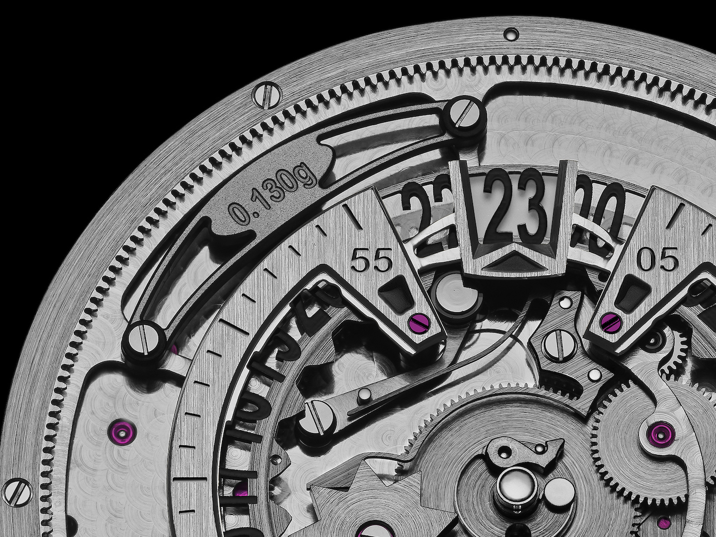 In the HW63 manufacture caliber, the minutes display is not powered from the centre: instead, it rotates around the inner edge of the bezel in a module mounted on an external arc, linked to a gear arrangement concealed beneath the bezel. This puts the module in orbit around the outside of the dial, guided by the gear system.