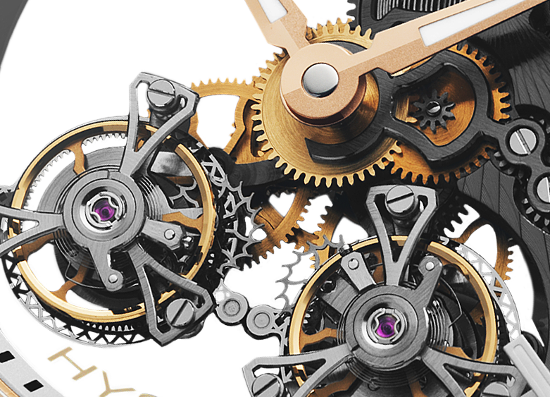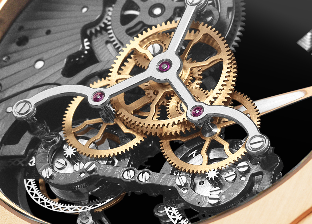 The mysterious interaction of wheels, springs, levers instilling life to the watch are brought to light as well as two independent beating tourbillons providing a better precision to the mechanism. Each calibre’s components were thoroughly finished by hand, their curved volumes unveiling themselves as delicate watermarks highlighted by the reflexion of the light’s majestic dancing along their fine polished angles.